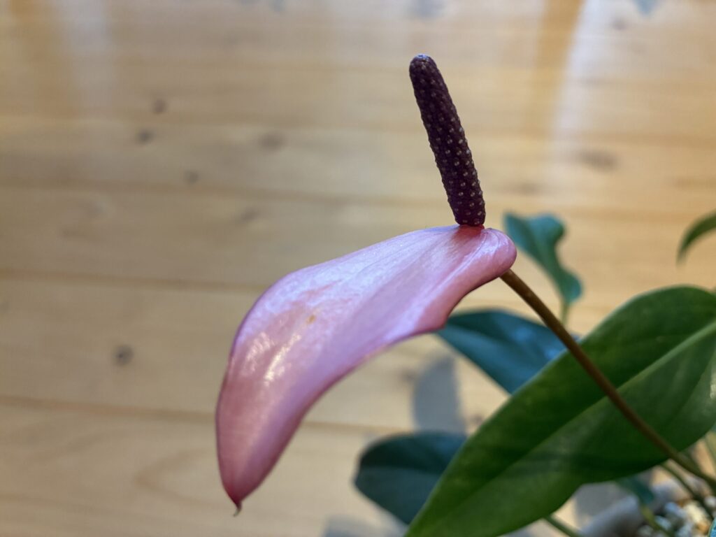 しっかりとした艶のある葉、ピンク色の仏炎苞(ぶつえんほう)が特徴的なアンスリウム。