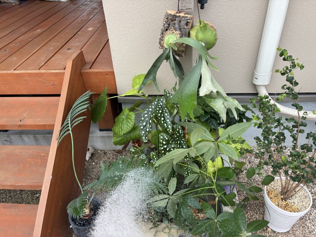 鉢の水切り中は、室内の植物たちに葉水を与えます。