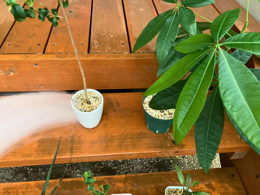 今日の水やりは、少し雨を感じながらウッドデッキの階段で。