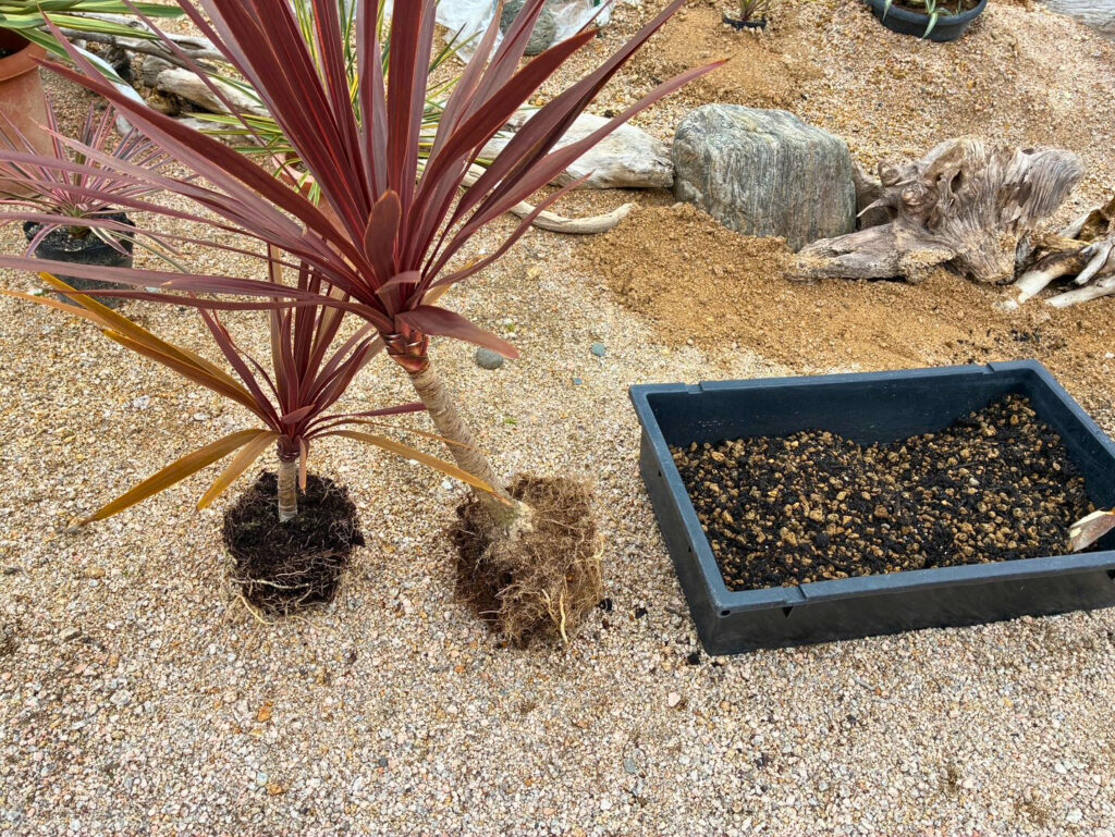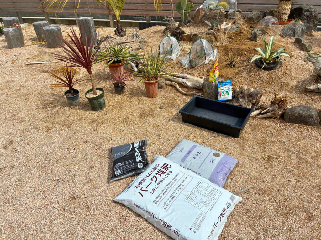 そこにバーク堆肥とボラ土を混ぜ込んで、排水性の高い土台を仕上げ。